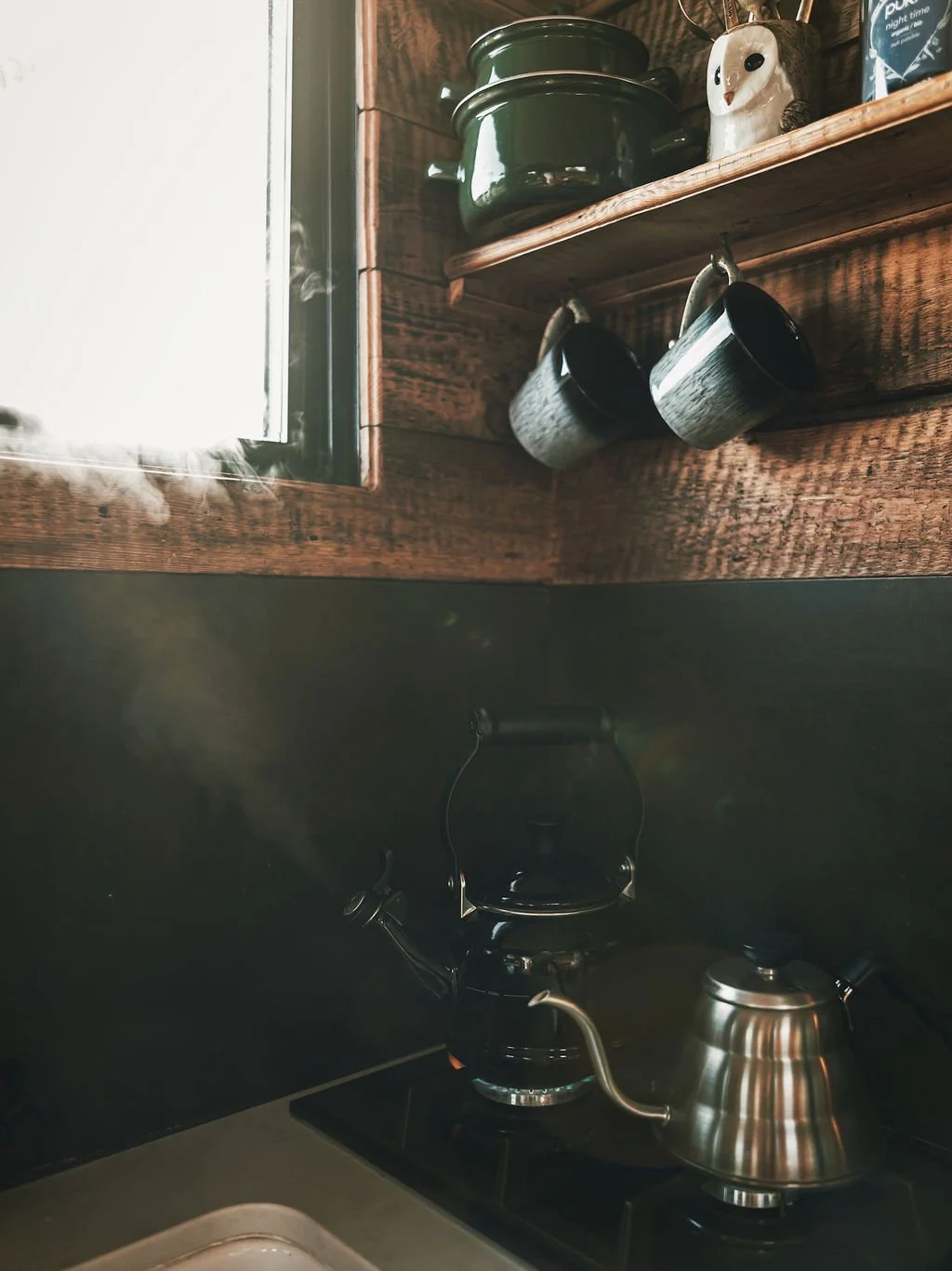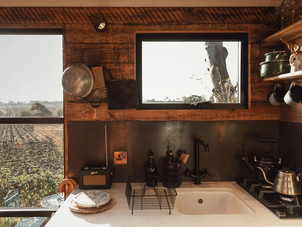 Fully-glazed french doors look out over the stunning view whilst the comfy retro armchairs recline next to the log burner. The kitchen includes a mini fridge, gas hob, coffee grinder and V60 filter and all the utensils and cooking essentials you might need. The complimentary welcome hamper has essentials and a few surprises! A selection of books and games are also provided for those rainy days.
